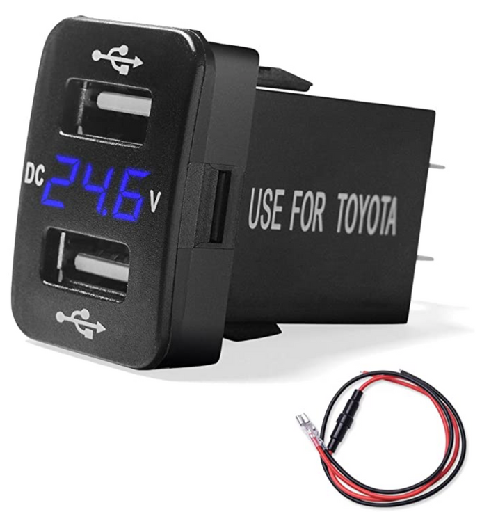 YJ-UVU-T001N Dual USB Charger + Volt Display for Small Toyota Push Button Switch Blue LED - New Model