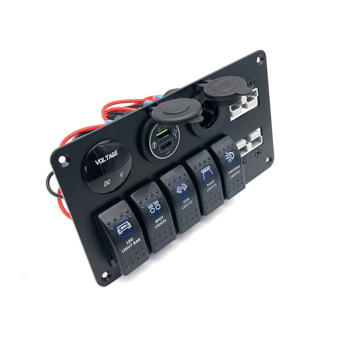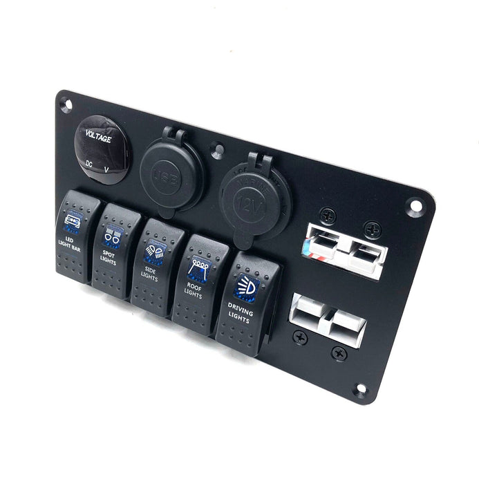 - A flush mounting bracket with a recessed 50A Anderson connector, 5 x Rocker Switch (Printed LED LIGHT BAR, SPOT LIGHTS, SIDE LIGHTS, ROOF LIGHTS, DRIVING LIGHTS) , Cigarette Lighter Socket, Dual USB Charger & Voltmeter for mounting into trims and panels.
