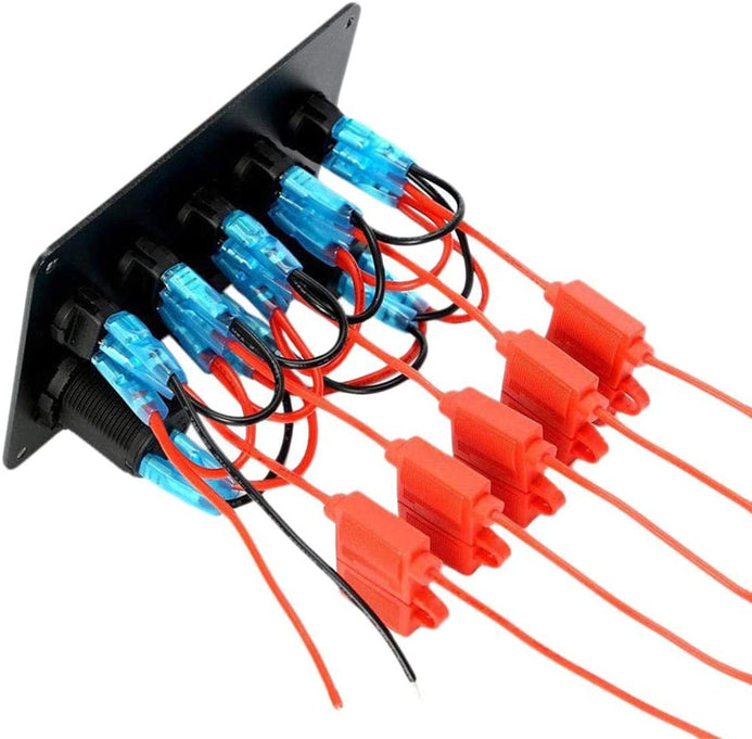 This 12V 24V 5 Gang Switch Panel features 5 Switches, Dual USB 4.2A Port, Digital Voltmeter & Cigarette Lighter Socket. The panel is made of high quality ABS material and measures 150 x 105mm (w x h). It will work on most 12V/24V car, boat, caravan, bus, trailer etc. The panel is waterproof and the charger ports come with rubber seal-cap to keep it water-tight. It also comes with a circuit breaker (including fuse holder & fuses) to protect the switches & chargers from overloading/short circuit.