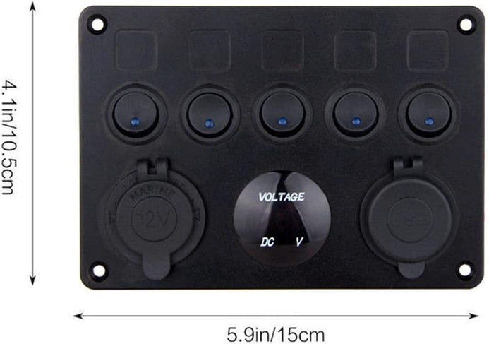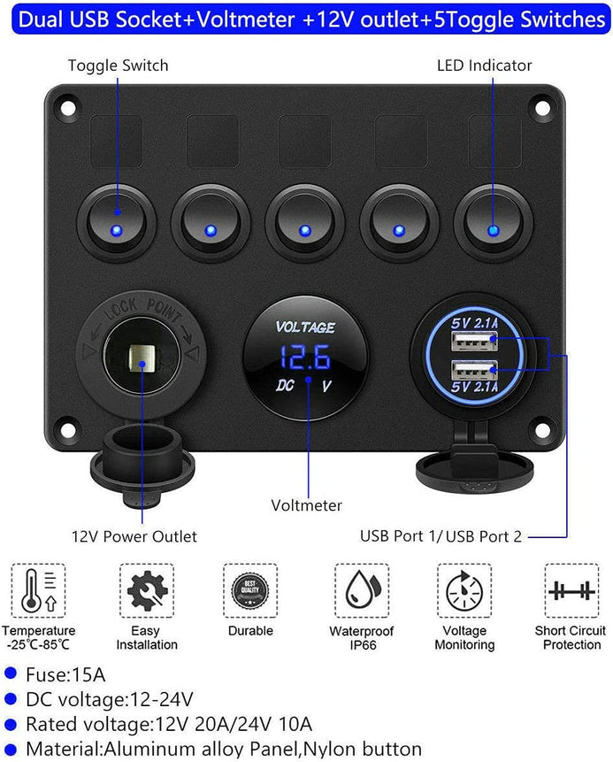 • 12V 24V toggle switch panel is integrated with dual USB port 5V 2.1A, digital voltage display, blue LED light indicator, waterproof board and 5 on/off rocker switches, great for all types of circuit control, charging needs and voltage monitoring.