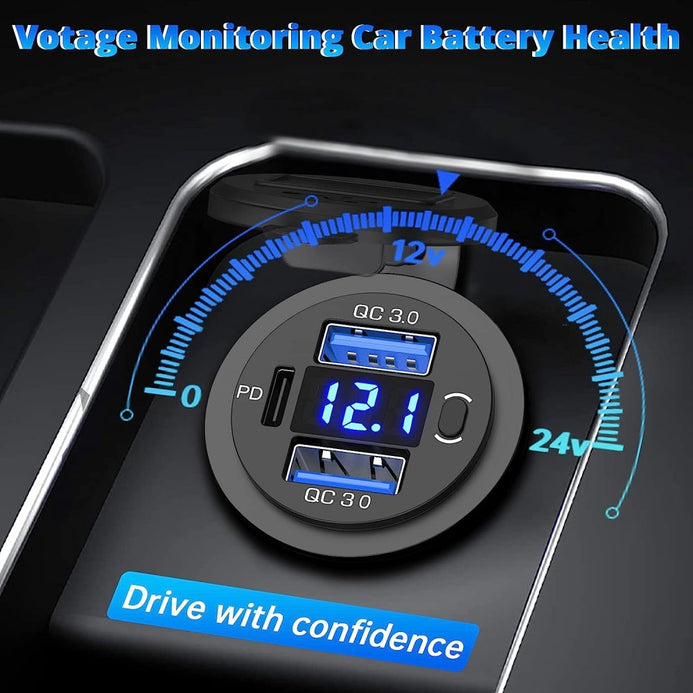 - LED Voltmeter and Button Switch - Power switch controls all 3 USB ports and voltmeter. Note: The switch will automatically switch on by default when car starts.