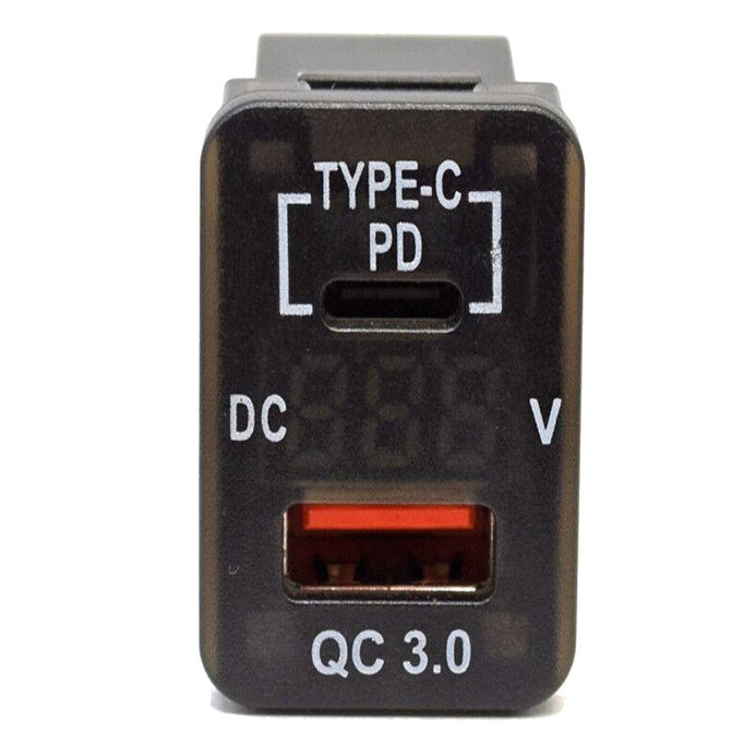 YJ-TVQ-T001O PD Type C + QC 3.0 USB Charger with Volt Display for Large Toyota Push Button Switch Blue LED - Old Model